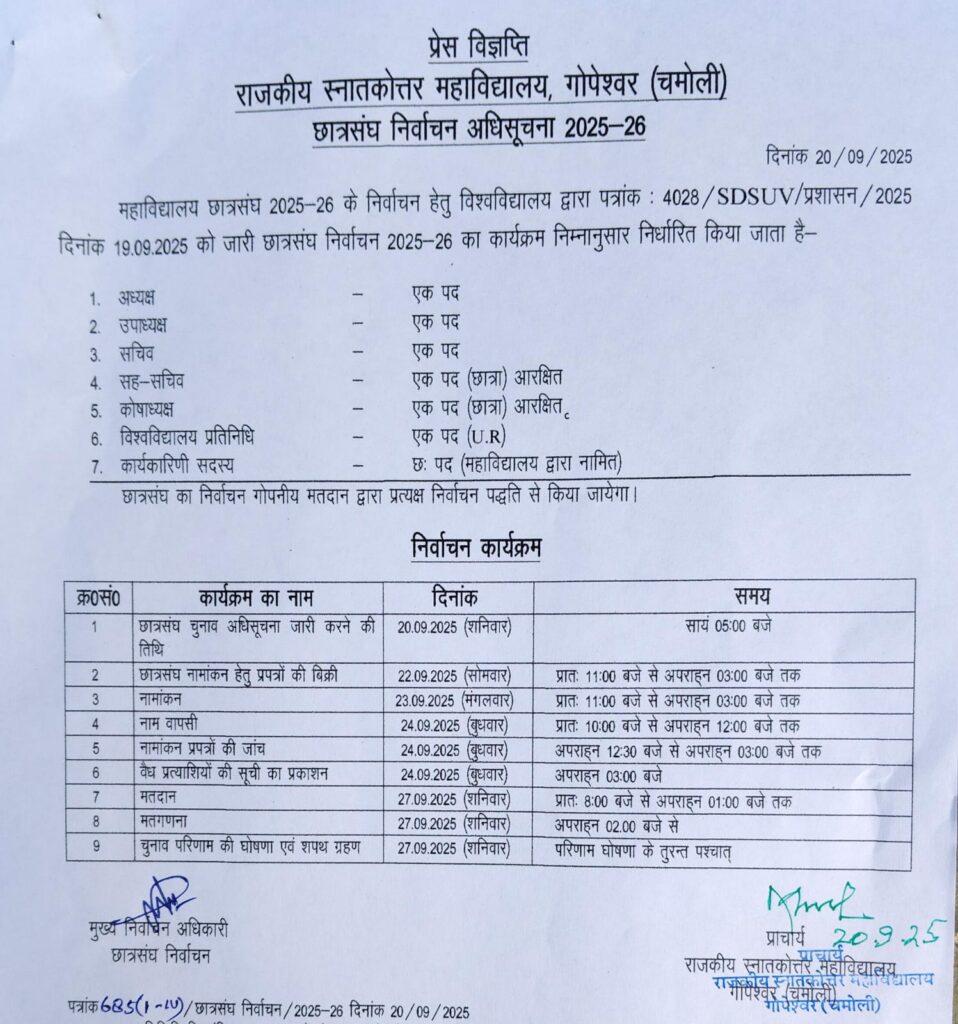 Gopeshwar: The notification for the 2025 Student Union Elections has been issued at the Government Postgraduate College, Gopeshwar. Principal Prof. MP Nagwal, issuing the notification, stated that student union elections will be held for a total of six positions.